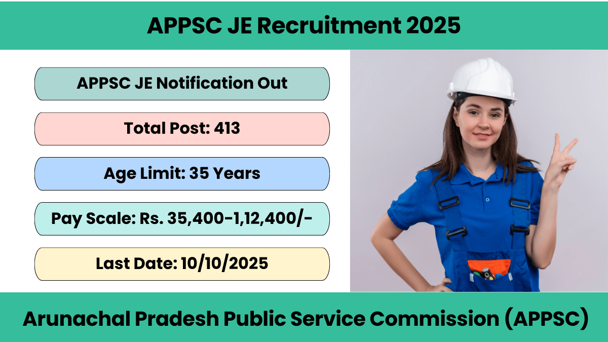 APPSC JE Recruitment 2025: The Arunachal Pradesh Public Service Commission (APPSC) has officially opened online applications for the Junior Engineer Common Recruitment Examination 2025. This year, the commission is offering 413 vacancies across multiple works departments under the Government of Arunachal Pradesh. Interested and eligible Indian citizens are invited to apply for these sought-after engineering roles by visiting the official portal: https://appsc.gov.in/
